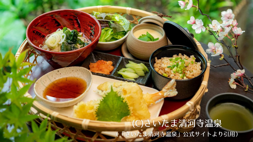 お食事処「竹菜和」では、産地にこだわった十割蕎麦や揚げたての天ぷら、川越三元豚を使った「三元豚とんかつ」などメニューが充実。「清河寺鐘つき御膳」は、そば(またはうどん)・炊き込みご飯・天ぷら盛り合わせ・茶わん蒸し・小鉢・サラダをいちどに味わえると大人気です。